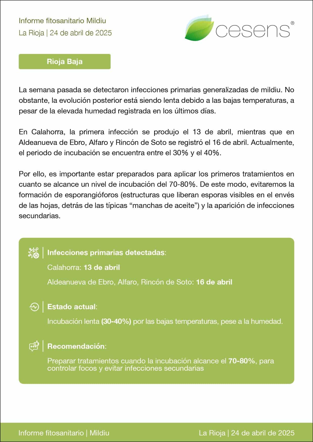 Rioja Baja: Infecciones detectadas el 13-16 abril. Incubación entre 30%-40%. Se recomienda aplicar tratamientos cuando alcance el 70%-80%.