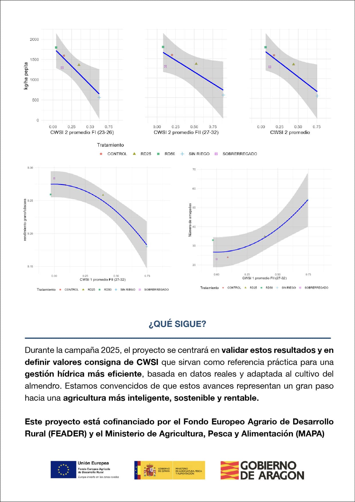 Los ensayos realizados han permitido comparar diferentes estrategias de riego —desde el exceso hasta la ausencia de riego, incluyendo opciones intermedias—, y los análisis muestran una clara relación entre los valores de CWSI y aspectos clave de la producción, como el rendimiento por hectárea, el tamaño medio del grano y la calidad del fruto.