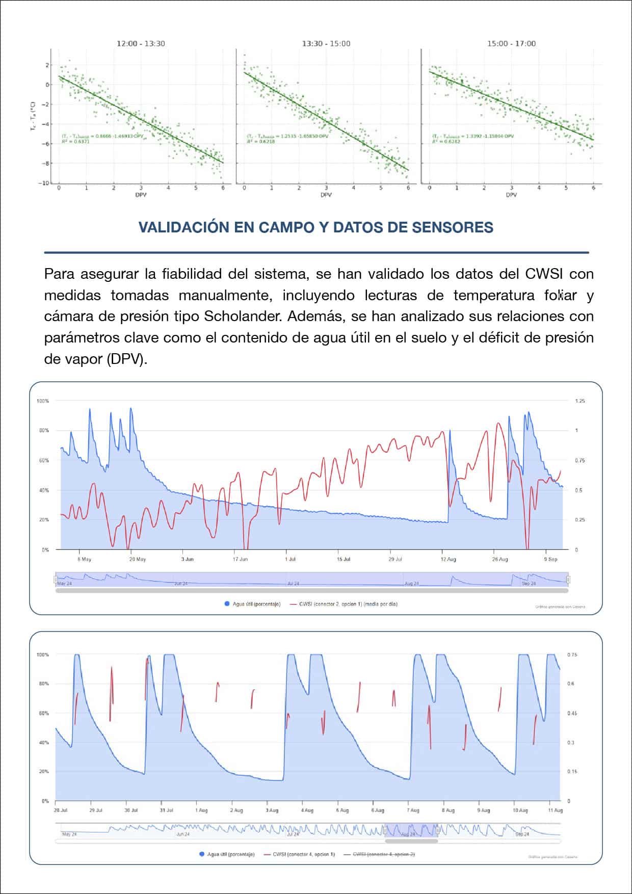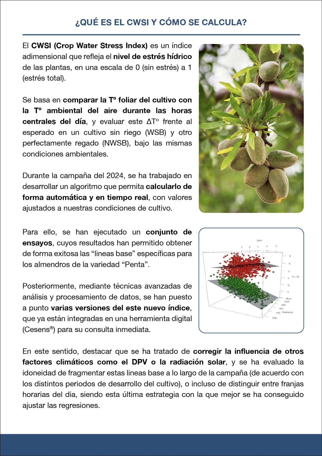 En la campaña 2024 se ha desarrollado y puesto a prueba un índice de estrés hídrico (CWSI) diseñado específicamente para este cultivo. A través de sensores ambientales y tecnología térmica, este indicador permite evaluar en tiempo real el estado del almendro y consultar los resultados de manera sencilla gracias a herramientas digitales como Cesens®.