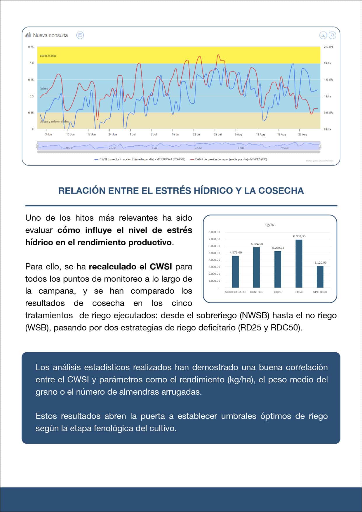 Los ensayos realizados han permitido comparar diferentes estrategias de riego —desde el exceso hasta la ausencia de riego, incluyendo opciones intermedias—, y los análisis muestran una clara relación entre los valores de CWSI y aspectos clave de la producción, como el rendimiento por hectárea, el tamaño medio del grano y la calidad del fruto.
