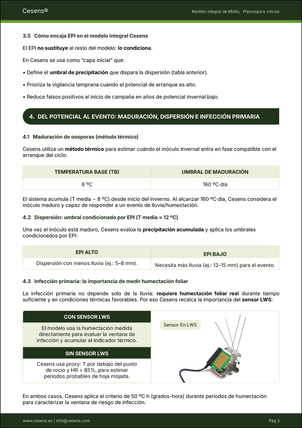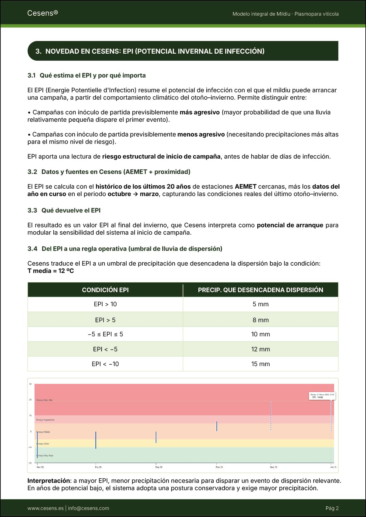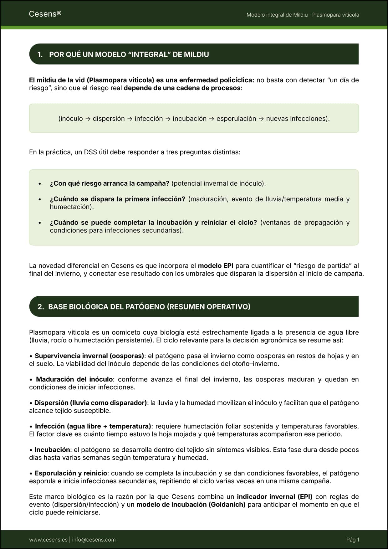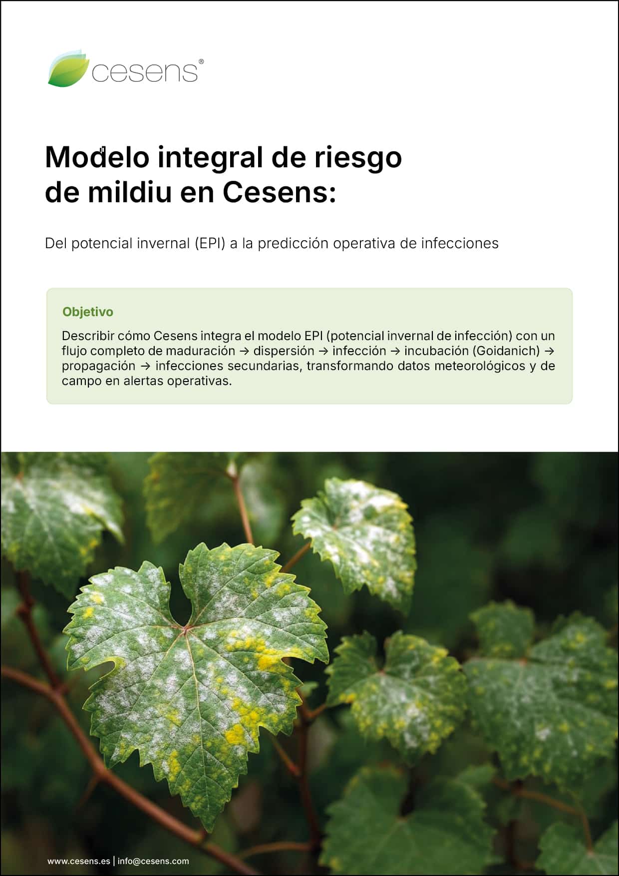 En este artículo te mostramos cómo funciona el modelo integral de riesgo de mildiu en Cesens y, especialmente, la nueva integración del modelo EPI (potencial invernal de infección) dentro de nuestra metodología. Esta incorporación supone un paso más allá de la detección puntual de días de riesgo, ya que permite analizar la dinámica completa del patógeno desde el potencial de arranque de campaña hasta la predicción operativa de infecciones primarias y secundarias.