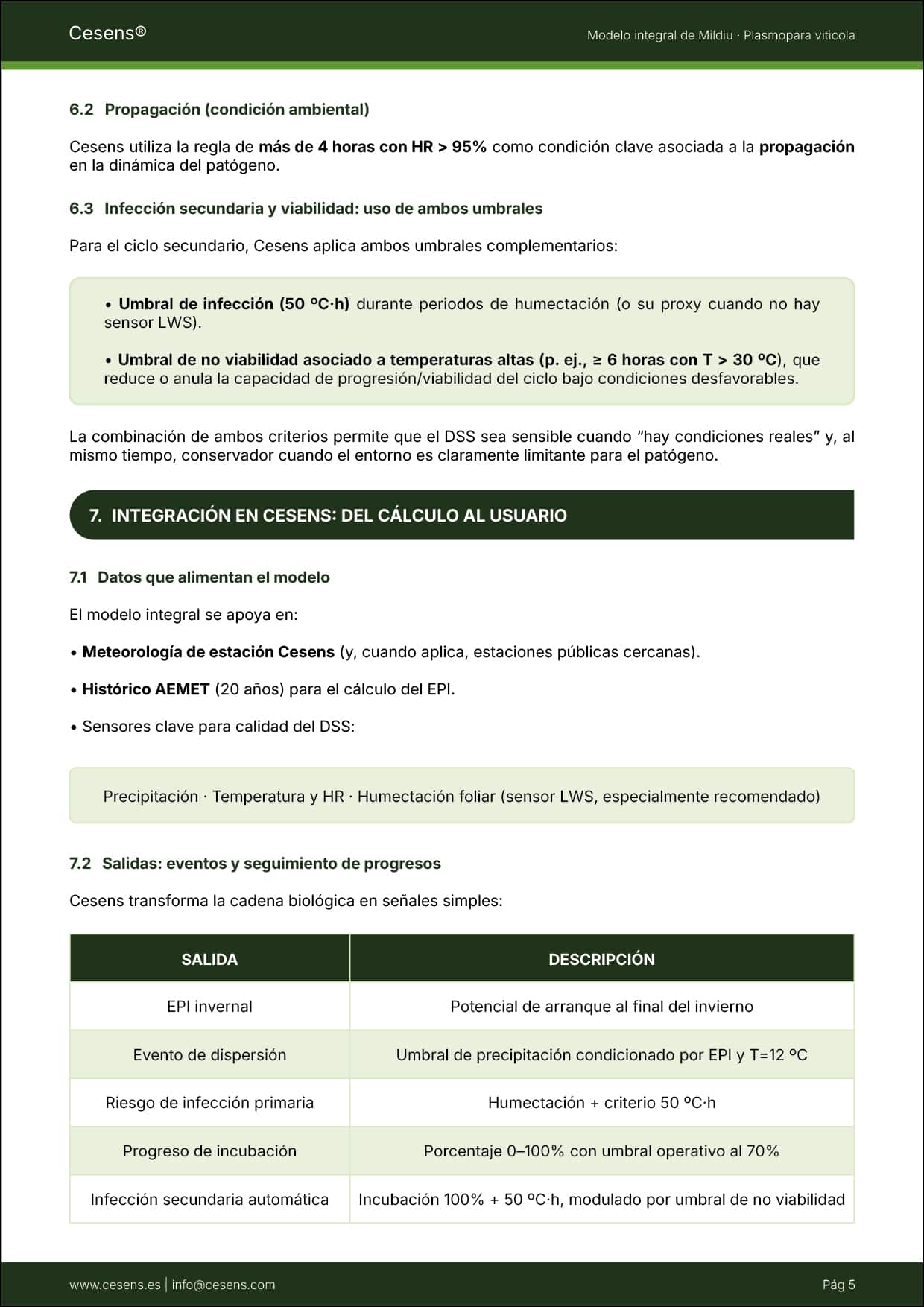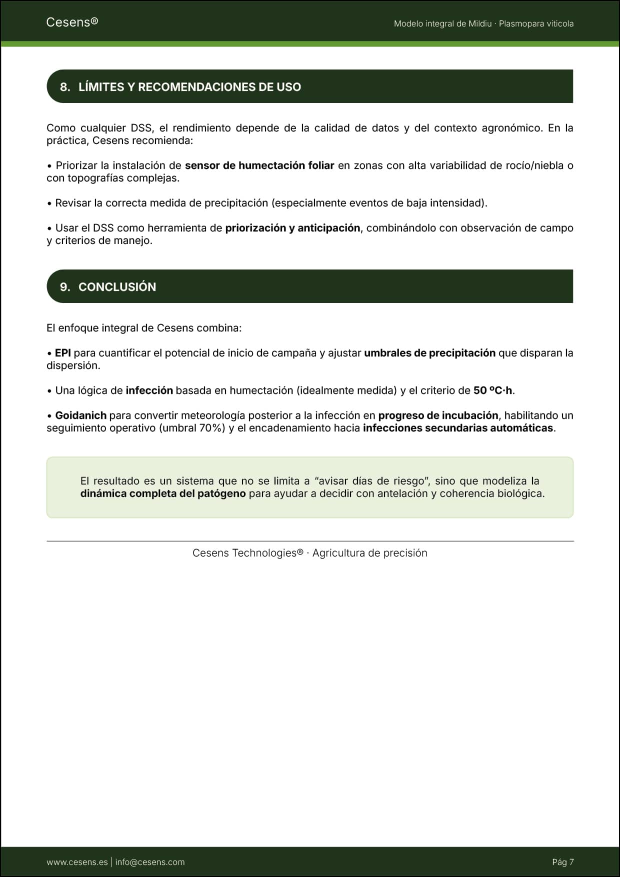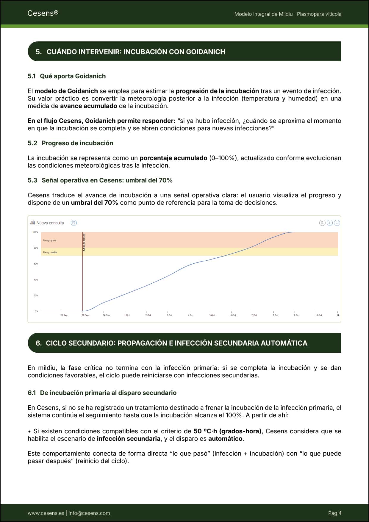 A lo largo del contenido explicamos cómo Cesens integra variables como la maduración del inóculo, la dispersión condicionada por el EPI, la humectación foliar, el modelo de incubación de Goidanich y el seguimiento de la propagación e infecciones secundarias, incorporando además el efecto del registro de tratamientos y los días de protección para reflejar con mayor fidelidad lo que ocurre realmente en campo.